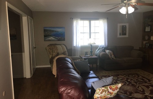 This 2,100sf 4BR, 2BA, 2-car garage 1-level house was the parsonage for a church. The church building & parsonage are the only 2 structures on the block. The church building is now leased by a church that does not use the parsonage. The dining table seats 6 & another table seats 4. The great room is GREAT with plenty of room for 2 full-size couches, a loveseat, & a recliner. There is a smart tv in the great room & all 4 BR's. 2 king beds & 2 queen beds. With couches, recliner, & inflatable mattress, can sleep 13. This house has no carpet & no neighbors! This house is not in a subdivision. It is the only house on the block. It offers at least 2 acres of flat yard for outdoor activities. Besides the 2-car garage, the driveway can comfortably accommodate another 6 cars, & the church parking lot is almost always empty with abundant parking spaces. Within a few blocks are several ff & "sit down" restaurants, several C-stores, a Dollar General, a veterinarian, & many other businesses.