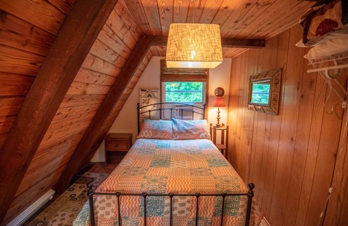 Size doesn't matter when you have your own garden spot directly on the New River. A Frame of Mind is a traditional A-frame cabin with a beamed vaulted living room, providing the cozy cabin atmosphere you've been dreaming of. The open floor plan on the main level includes a living room with TV, a small but well-equipped kitchen, a bedroom with a full bed and a full bath. For additional sleeping accommodations, take the spiral staircase to the loft, where you'll find two twin beds.