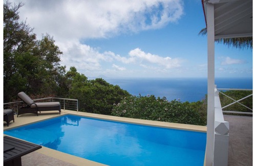 The beautiful Compass Cottage overlooks the Caribbean Sea, St. Kitts and Nevis, which you can observe while sipping a drink in the pool or by the gas fire pit at night after a day of hiking or diving.