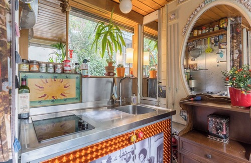 The houseboat is for 2 guests with a king size bed 2m/1m80 with its overhead window for watching stars, surrounded by a paintings gallery and its large Louis XV mirror reflecting the South windows over the canal.