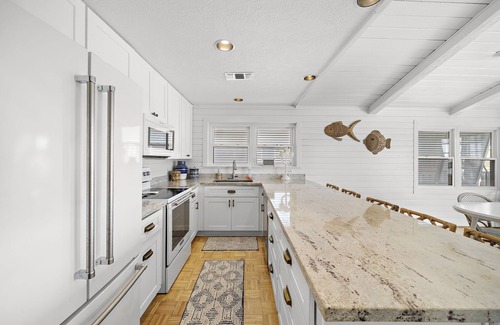 Inside, the home is warm and welcoming with farmhouse shiplap walls, wood floors, and an open-concept layout perfect for socializing. Upstairs, you'll find the main living area, a stylishly remodeled kitchen with modern appliances, and a cozy dining area—all with views of the surrounding wetlands. The primary bedroom and a second queen bedroom share a full bathroom upstairs.