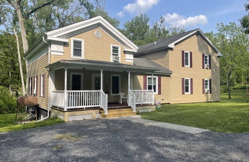 This beautiful large 2 story home is set back off the main highway, snuggled back in the woods. Home includes all modern amenities, including gorgeous hardwood floors, 4 large bedrooms (master bedroom - 2 queen size beds, bedroom 2 - 2 twin beds, bedroom 3 -1 queen bed, bedroom 4 - 1 queen bed, all rooms have large closets and dressers. 3 full baths all have tub/shower combos, towels/washcloths and laundry baskets. Large full kitchen - includes all dishes, utensils, coffee pot, microwave, side by side refrigerator, stove/oven combo, and island bar with 3 stools. Dinning room right off the kitchen that seats 6. Large living room with a hide away bed and and a couch that also is a bed with charging ports and a family room. Laundry room has washer and dryer, both are front loaders. There are ceiling fans, stand fans and fans. Air conditioners in the bedrooms. Nice front and back porch with outdoor furniture, large yard with a propane grill. Enjoy the sounds of nature and the running of the beautiful fishing stream right off the back yard, or enjoy a nature walk down the Catherine Valley Trail, a short walking distance from the front door. Air conditioners added to the living tooms in 2023. The house is located about 8 miles from Seneca Lake.