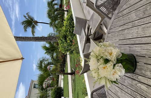 Upstairs features two bedrooms (one king and two twin beds) both with en suite bathrooms and air conditioning. It has a kitchenette and a spacious outdoor patio overlooking both the beach, the shared pool and lush gardens. Villa FantaSea offers free WiFi, maid service twice a week and free parking.