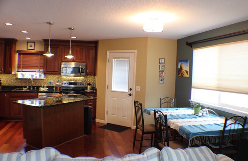 Kitchen/living: the kitchen opens to the living room (with gas fireplace) for an airy feeling during meals and hanging out. Dining table comfortably seats 6-8.