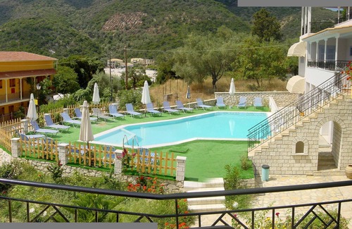 A penthouse suite in the middle of picturesque Mikros Gialos bay, on the south side of spectacular Lefkada island. Built by the sea it can comfortably house two to five guests. As well as from the two balconies, the exquisite sea view is enjoyable from indoors. Taking advantage of the amphitheater setting you have both the panoramic view of the bay and are just steps away from the beach and the restaurants. The interiors are just as appealing. From the prettily tiled shower room to the tastefully chosen fabrics and furnishings, the standard of finish is immaculate, and the provision of air-conditioning is a welcome bonus, especially in the peak summer months. Set along the Bay’s shore line, the property is dressed in native greenery and flowers and shaded by trees, creating and ideal setting for the spacious accommodations and a variety of recreational amenities. Set right by water so turquoise and diaphanous you cannot wait to dive into it, and with a small ivory colored beach on one side, and the pretty, sheltered bay in front. You can also enjoy a relaxing day at our sunny pool.