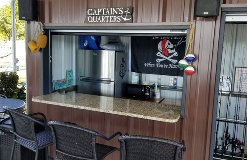 The entryway/living room boasts the warmth of a sky-lit ceiling and a straight-on view of the main channel. There’s plenty of seating surrounding a fireplace (with an electric insert) for chilly evenings along with a mounted flat-screen TV equipped with a Firestick and high-speed fiber for streaming.