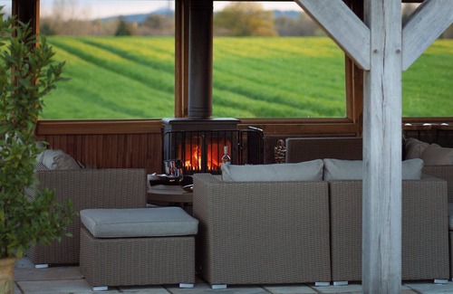 Outside is a large garden room, perfect for al fresco dining or relaxing. The glazing on two sides allows you to take in the wonderful views of the Shropshire hills in the distance whilst sheltered from the weather. There is a sunken lawn surrounded by flower beds. Guests can also explore 150 acres of beautiful grounds with park land, lawned garden, a private lake and surrounding fields.