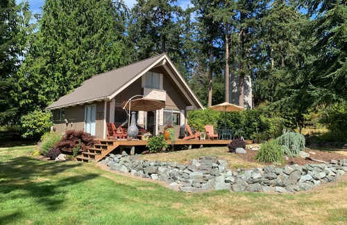 This charming vacation cabin nestled among tall pines and cedars features stunning western views of Puget Sound and the Olympic Mountains. It includes community beach access to a beautiful sandy beach on Mutiny Bay, considered the "Gold Coast" of Whidbey Island. A community tennis/pickle ball court and outdoor swimming pool (in season) are also available.