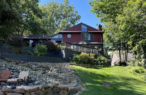 The property features a waterfront of a 100 feet of Sandy beach, large dock and meticulously maintained property! The home offers 5 bedrooms, 3 bathrooms, a wood burning fireplace, gorgeous fire pit over looking the lake. The yard is perfect for family games or just relaxing. This is a tremendous home that can be shared with 2-3 families. Home can sleep 16-20 people. It will book quickly send your request today!