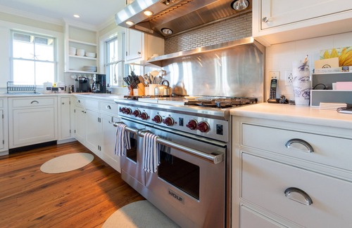 First Floor: Enter into a foyer with a powder room. To the left is a well-organized mudroom with a full washer and dryer. Straight ahead and to the right is a fully-equipped kitchen with two dishwashers, a SubZero fridge, and Wolf gas range. An impressive center island creates a great gathering spot to experience the terrific views of Hither Creek. To the left is a dining table for eight guests and a mahogany dry bar with a SubZero fridge.