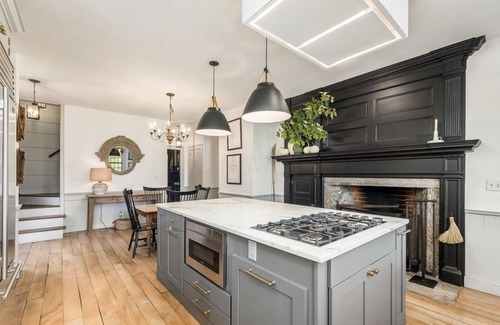 The kitchen was recently renovated keeping in mind the historical home. A large island made of marble is in the center. A table for 4 is in the room. The highlight of the room is large original cooking fireplace. This has been converted to gas for easy use.