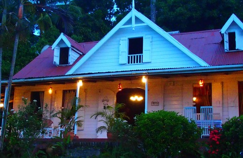 La Plantation des Manguiers (Mango Plantation) dates back over 100 years. It has all the hallmarks of a house built to make the most of the climate in years gone by before air conditioning. The windows sport big heavy shutters and there is no glass, allowing the balmy trade winds to flow through the house. The sheltered wrap around veranda stays cool from morning to night protecting the interior from the heat of the day. From this sleepy veranda you can relax whilst watching the world go by in the distance. The commanding view changes constantly, with sailing boats, small planes, cruise ships, the changing colors of the sea and the sky all offering entertainment. On a clear day Martinique can be seen, sometimes so clearly that you feel that you could swim there! The interior of the house is elegantly decorated and furnished in keeping with the 'plantation' style wherever possible and is comfortable and inviting whilst still offering all the mod-cons to ensure a relaxing stay.