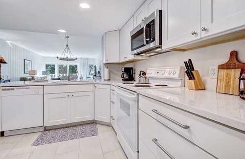 The kitchen is updated with white cabinets, and quartz countertops and stocked with all the essentials including a toaster, blender, tea kettle, knife set, cutting board, pots/pans, and regular coffee maker. The breakfast bar and dining flow effortlessly to the main living area and sliding glass doors that lead to the private balcony overlooking beautiful island greenery.