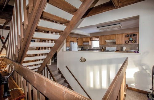 In addition the aforementioned full bathroom, the main level also features a large kitchen and cozy open dining and living room with a gas fireplace and sofa sleeper. Patio doors open off the living room and kitchen for access to the large solarium, which is perfect for gear storage.
