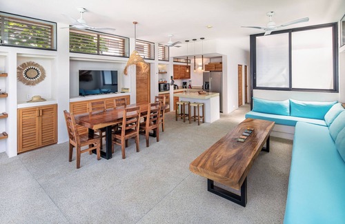 Master bedroom has a king size, comfortable bed and en-suite bath. 2nd bedroom has queen bed. 3rd bedroom has 4 twin size beds in bunk form. Open concept living room, dining room and kitchen open up to the private terrace with a stunning view of the Pacific Ocean.