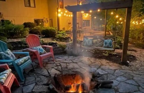 Enjoy nature and serenity in our secluded backyard—lushly filled with tiered perennial gardens, sculptures, a stone fire pit area, and large Trex deck. Grill out, chill out, or use the WiFi to work outside.