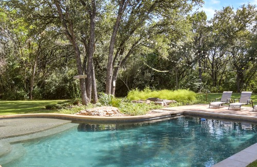 The Longhorn Estate by ABOVE Vacation Residences is the perfect escape while enjoying close proximity to all that downtown has to offer. This private luxury estate sits on two acres filled with Texas native Live Oak trees with a spacious backyard that is perfect for small events. The great room enjoys this same peaceful view of a beautiful pool with sunning ledge/beach, covered outdoor lounge area and strings of lights to provide that beautiful glow in the evenings. There are three main living areas in which to spread out and relax as well as a private office/flex room for a little work. This property is regularly set for 10 guests, but, with homeowner approval, can host as many as 14 guests with luxury Frontgate beds which would also be set with ABOVE standard luxury linens. Additional fees may apply. All guests must be pre-approved to rent this estate. A full guest list will be required.