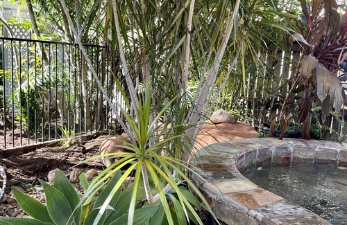 Tropical landscape gardens with private refreshing spa and large patios both side of the house .