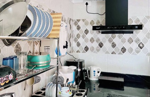 High speed WiFi 300mbps , Living room with dining, Kitchen with modern appliances, fridge and front load steam washing machine.