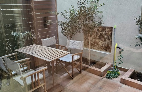 Apartment 02 is on the ground floor of a brand-new three-story building. This beautiful flat overlooks the Archaeological Park of Plato's Academy. The apartment is designed to host up to 3 guests and has access to a private patio with trees, plants, and a dining space for four people.