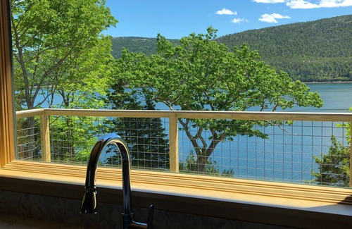Acadia Cove Cabin is located in a secluded wooded setting on the shoreline of Somes Sound, the only fjord on the eastern coast of the US. Located on the border of Acadia National Park, this two-story ocean-front house sleeps up to 8 people and commands views of the Sound, nearby Norumbega, Sargent and Acadia Mountains, and a wooded shoreline and private cove. The cabin is centrally located on Mt. Desert Island with only a short drive to Southwest Harbor, Echo Lake, and Acadia National Park trails and sites. From your deck, watch sailboats and lobstermen at close range, launch your own kayak from the beautiful private shoreline, and enjoy the stunning combination of woods, water, wildlife and granite ledges.