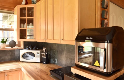 Ground level private entrance; kitchenette with new live edge Acacia wood countertops; dining space; a comfortable living room; 3 pc bathroom with heated floors; a beautiful rebuilt Loft stair; sleeping on main floor or loft in deluxe Queen, Double and Murphy beds;