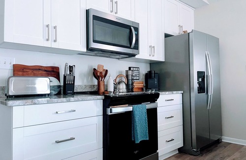 Explore our newly renovated single-story home featuring two bedrooms and two bathrooms, just a one short block to the beach and boardwalk. Our kitchen boasts an array of cookware and appliances to excite chefs of any skill level. We've provided essentials for families with children. Enjoy meals at a dining table for four, complemented by three counter-height bar stools. Relax in ample space, whether dining or unwinding in front of our 65-inch smart TV.