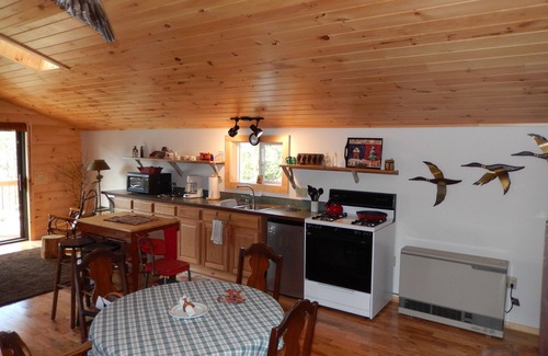The Goose Landing is a carriage house style suite. It is an Adirondack lakeside, second floor open concept unit. The newly built room is suitable for 4 guests and boasts an expansive view of Kiwassa Lake, which is part of the Saranac Chain of Lakes, and gorgeous sunsets. Log beams, vaulted ceilings and knotty pine interior make this rental feel modern and cozy at the same time.