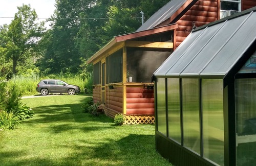 Whimsical cabin all seasons! Sleeps 8 - Amish built w/ 3 season screened front porch to watch sunset! Summertime lakes, swimming, boating, camping, hiking nearby trails and lakes. Autumn spectacular colors and views, Wintertime skiing, snow mobiling and hunting minutes from local craft Brewery! Living room full sleeper sofa, thermostat controlled heater glass window for ambiance! Electric appliances incl. stove, washer/dryer, refrigerator, ac, tv/Roku, 2 upstairs lofted queen bed sleeping areas w/ addtl. pull out sleeper sofa, office desk/chair space, Fresh pure Artesian well! Cabin written about in memoir Tiny House Tale.