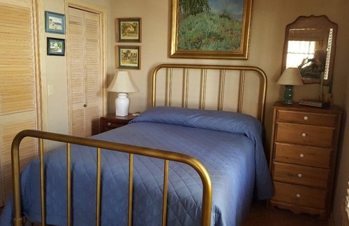 One large bedroom has a queen-sized bed and the smaller one has a double bed and an outside entrance. They share a bathroom with a shower. All towels and sheets are furnished. The living area includes a cozy living room and a fully-equipped kitchen with eating area. There's a washer and dryer in the bathroom. The larger bedroom and the living room have smart TVs and wireless internet is available throughout the house.
