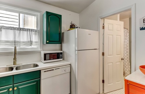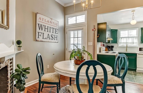 Duckie's Cottage is a true artist's retreat located in the midst of great shopping, dining, museums, and more on East Broad Street. It's a wonderful choice for guests seeking Savannah vacation rentals with room for up to six people. This two-bedroom, one-bathroom showstopper boasts a vibrant interior full of artsy, eclectic décor. Once settled in, guests enjoy a shared courtyard with seating on the deck in the back of the home.The home also boasts a classic Savannah covered front porch with a pink front door. Duckie's Cottage also has the distinction of being situated next door to Mother Mathilda Beasley Park and Dog Park. There simply isn't a more charming place to stay when seeking Savannah vacation homes with room for six!