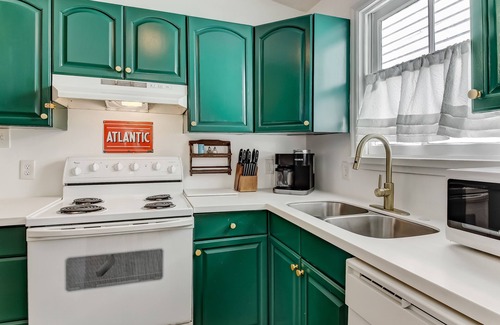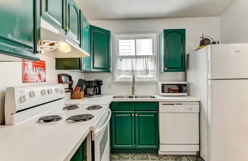 This home has a semi-open concept that creates an airy, spacious feel for up to six guests. Step into an adorable living room that prickles the senses with bold artwork on the walls, blue couches, and dual-sided stone fireplace. A mounted smart TV with streaming access ensures that nobody will miss their favorite shows! The living room opens to a sunny dining area featuring a table with seating for four set beside the opposite side of the grand fireplace. Next, a full kitchen with forest-green cabinets provides ample space for preparing meals while on vacation. Enjoy a full-sized oven, dishwasher, refrigerator, and microwave. The kitchen also comes equipped with cooking tools.