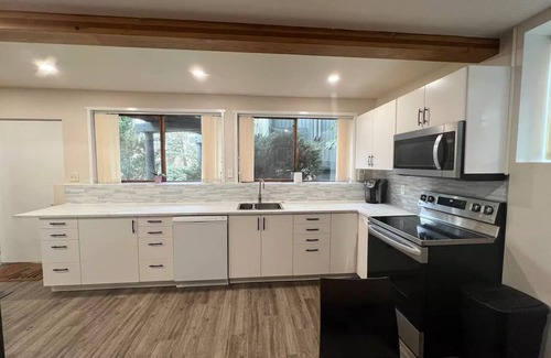 Relax while you stay at this peaceful and beautiful place with free parking and WiFi. Our cozy 400 square foot space includes a fully equipped kitchen with a dishwasher, refrigerator, coffee machine, and all necessary cooking utensils, allowing guests to prepare their own meals if desired. The sleeping room offers a comfortable and inviting atmosphere, complete with a plush bed, dresser, closet, nightstand, and a large smart TV for your entertainment needs. The bathroom is functional and includes a toilet, sink, shower with shower gel, shampoo, and conditioner, as well as towels for your convenience. Additionally, we provide washing and drying machines for your laundry needs, along with detergent. Whether you're looking for a quiet getaway or a functional space to call home during your travels, our place has everything you need for a comfortable stay.