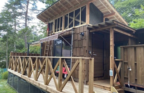 The facility includes a fully equipped villa and the garden features a wooden deck treehouse and tent space for your favorite tent
