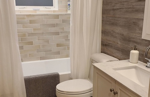 Designed and owned by local interior designer Birgitte Marthinsen(BMDesigns), this space is incredibly unique with rustic wood post and beams, reclaimed doors and a custom reading nook/daybed with extra storage. With 9' ceilings, special design features and a kitchen that has everything you need to cook a 5-course meal, this suite is your home away from home!