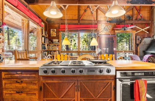 This cabin's abundance of charm oozes from its every corner and crevice. Pulling up you'll feel as if you're in another realm. Wrapped around the cabin's exterior enjoy a sprawling deck with ample seating and a grill. Inside you'll find that the attention to detail and warmth seems to continue effortlessly throughout each room. The living room is adorned with plush furnishing, a wood-burning stove, and a TV. Enjoy this space come morning or evening with those you love the most. The nearby full kitchen offers a delightful array of whimsical notes in its cabinetry and decorations. Utilize the stainless steel appliances and ample meal prep space before serving a delicious dinner at the adjacent formal dining table.