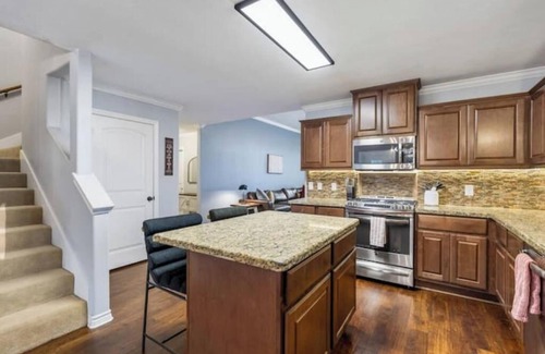 Enjoy a fully stocked kitchen with modern appliances, cookware, and coffee options. Whether you're making a full breakfast or late-night snacks, everything you need is here. The open-concept layout flows into the dining and living areas, perfect for staying connected while you cook, eat, or catch the game on the Smart TV.
