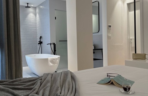 Daphne Suite is a studio apartment on the third floor of the building, overlooking the patio. There is one bedroom, an open plan bathroom with a bath tub and a shower, and a living area with a sofa that can be set as bed, as well as a kitchenette.