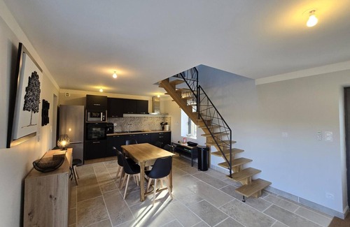 Air-conditioned house with views of the surrounding countryside. You will have a main room equipped with a dining area, living room (TV, internet), kitchen with oven, dishwasher, combination freezer, and microwave. On the ground floor, a bathroom with a shower stall, toilet, and washing machine.