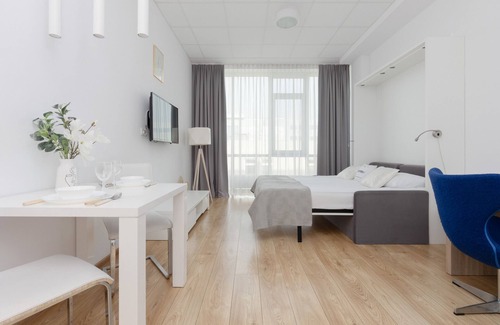 This charming 32 m² studio can accommodate 2 people. Perfect for a romantic getaway with your other half or a business trip. It consists of a living room with a double bed, a kitchenette, a bathroom with a shower. The decor of the apartment is very cozy and homely, personalized by finishing with subtle decorations and stylish furniture. The apartment is equipped with a flat-screen TV and free Wi-Fi. A wide range of bathroom and kitchen amenities (including a dishwasher and ironing equipment) meet the needs of our guests while traveling. The property is an ideal choice for anyone who appreciates comfort and functionality, but also aesthetics. Complimentary toiletries, linens and towels are provided to facilitate the start of each stay. The apartment also offers additional accommodation for children: parents traveling with small children will be provided with a crib upon request. Guests traveling by car, can take advantage of the free parking zone under the block.