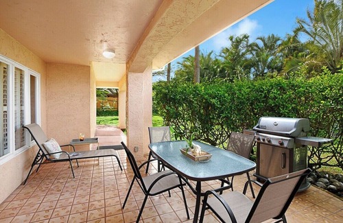 Poipu Ala Moana Hale is a 2-minute walk to Grand Hyattis a lovely three-bedroom, two-bath townhome surrounded by a beautifully landscaped garden oasis. Set in a quiet resort neighborhood, Poipu Ala Moana Hale offers a peaceful and serene atmosphere for a perfect Kauai getaway. The living room offers cozy, comfortable furnishings with a walk-out to the patio area which is perfect for alfresco dining. The fully equipped kitchen provides all the appliances, cookware, and dishware for preparing delicious meals or refreshments. Personal barbecue grill provided for those who love to add that grilled char or smoky flavor to their dining.