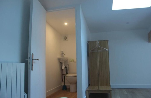 Allée des roses A very charming workshop located between the Gironde and the Dordogne. 10 minutes by car to go to the village of Saint-Emilion and very close to the Gulf of Grand Saint-Emilionnais (2 km). Surface of 55m2 with equipped American kitchen, a bar with 4 stools, a living room area with a sofa bed, bathroom, washing machine, toilet. On the mezzanine, a double bed, toilet. Velux window with a curtain.