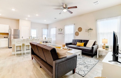 Designed with family gatherings in mind, the main-floor interior features an inviting, open-concept layout and a sparkling suite of up-to-date home appliances. Stainless steel appliances and gorgeous countertops shine in the well-equipped full kitchen. Twin sofas and a smart TV set the stage for movies or game nights in the living room. A dedicated desk can be found upstairs for remote working or home school convenience. Modern must-haves include central air-conditioning, free WiFi, and a private washer/dryer.