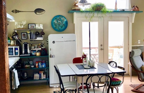 The Quiet Carriage house was crafted from reclaimed and repurposed materials. When staying at the Carriage House, the beach and Wilmingtons' attractions are yours for the taking. If you are boycotting another short term rental platform, the host sympathizes and offers a rental option here on VRBO. Guests often remark that it is like living in a tranquil treehouse. The high ceiling, artistic quirkiness and natural light are complimented by the mild and generous Carolina Blue Skies. A guest hot tub and fire pit enhance the gentle cooler months and the beach and Downtown Riverwalk are just a short drive away. The ever blooming and expanding garden is open for enjoyment and herbs are there for the picking. Wilmington offers excellent dining experiences. Outdoor adventures, both on land and water, abound and the local Ghost Tour's focus on so much local history while digging up the past! Historic sites, leisurely neighborhood walks, bird watching, farmers market, local coffee shops, brewery's and lots of place to shop and visit, provide entertainment and quality of life. Wilmington is perfect all year round. Inclement weather is very rare. The Carriage House is located in the Princess Place Neighborhood, next to Burnt Mill Creek -a bird watchers paradise. It is 1.5 miles to Downtown Wilmington and the Riverwalk and 7 miles to the Beach. Snowbirds and travel nomads know that Wilmington is wonderful year round. The Carriage house is perfect for business travelers and has high speed internet and is in close to the airport ILM (2 miles), which offers direct flights 10+ major cities and is serviced by several major airlines including American, United and Delta.