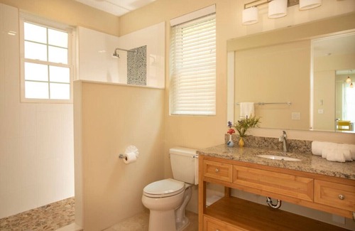 Allamanda 2 is a new beautiful 1 bedroom suite located at the mini resort Seagrape Vista in Cruz Bay, St John. This property is a 3 min walk to the Frank Bay beach and 8-10 minutes walk to downtown Cruz Bay. The outdoor patio has a table and chairs for two facing the pool area and St Thomas. The living room area has a dining table for 2. The kitchenette has all you need for cooking. The bedroom has a king size bed and the bathroom a walk-in shower. Smart TVs in living room and bedroom.