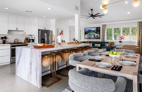 Alluring Palms boasts a stunning interior and a playful vibe. The living room provides a cozy wrap-around couch and seating area with a large wall-mounted TV. The dining/kitchen area is spacious and chic with a large island, striking marble-style counters, and a counter-height sitting area to complement the comfortable dining table for six. A full range of stainless appliances, a coffee maker, dishwasher, gas stove, and oven will make cooking for a group easy.