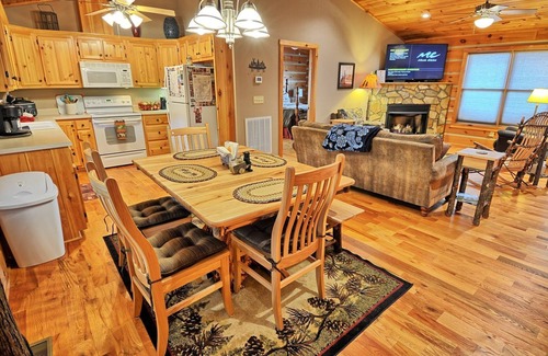 Main Level: As you enter our cabin, you will find the great room with plenty of seating, stone gas fireplace (seasonal) which is wonderful to snuggle up to on those cold mountain winter days, fully stocked kitchen with a regular 12 cup coffee maker AND Keurig maker, microwave, crock pot, blender and more, and the dining room. The 2 master bedrooms with queen beds have their own En Suite private bathrooms. Great for 2 couples!