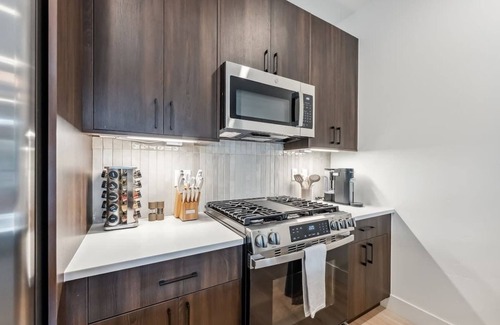 Located on the first floor of a stunning new building, Alpine Nest Escape welcomes you with a spacious, sunlit layout and a convenient ski and snowboard clips right at the front door. The fully equipped kitchen features modern appliances and an island with four bar seats, ideal for cooking and enjoying a meal at home.