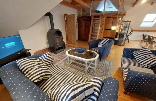 1-room Loft 70 m2, on the upper floor. Object suitable for 2 adults. Rustic and tasteful furnishings: open living/dining room with sloping ceilings with rooflight with 1 x 1 bunk beds (180 cm, length 200 cm). With sloping ceilings, open kitchen (4 hot plates, oven). Bath/WC. Heating. Wooden floors. View of the garden. Please note: non-smokers only. Private entrance.