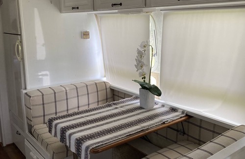 Beautiful Vintage Airstream set up for your vacation pleasure. Located in Beautiful Beaufort SC, this vacation rental is less than 3 miles from Beautiful Historic Downtown Beaufort, Parris Island, Beaufort MCAS, and is close to beautiful beaches and Hunting Island State Park! This well maintained Airstream is 34’ in length, sleeps up to 3.5 humans, has an eat in kitchen, twin beds in the master, sleeper sofa in the living room area, and the dinette also converts to a twin. Grill and outdoor fireplace on site.